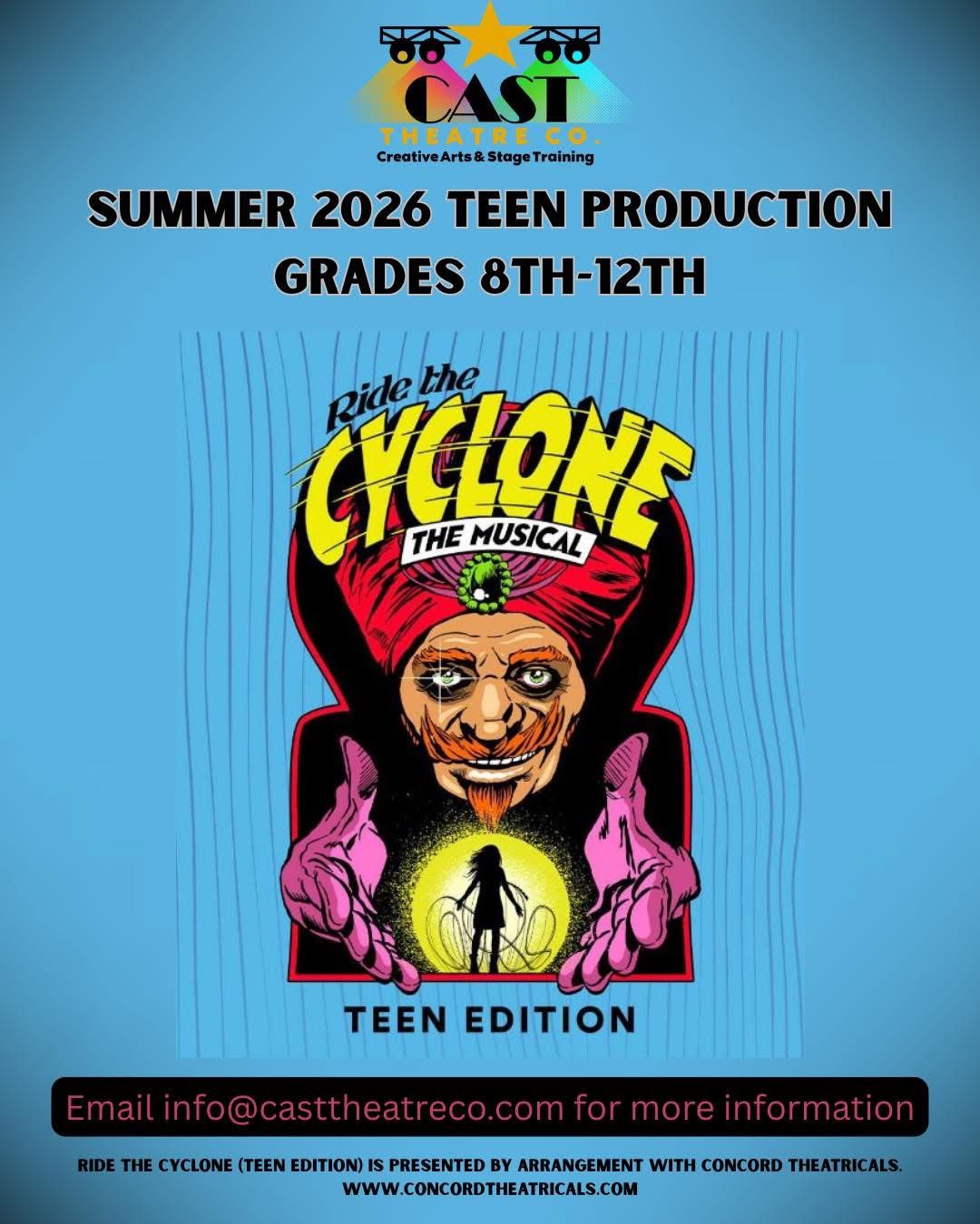 Join CAST Theatre Co. this summer for an unforgettable production of Ride the Cyclone (Teen Edition)! This bold and exciting musical follows six teens whose lives change in an instant, blending humor, heart, and powerful solo performances.